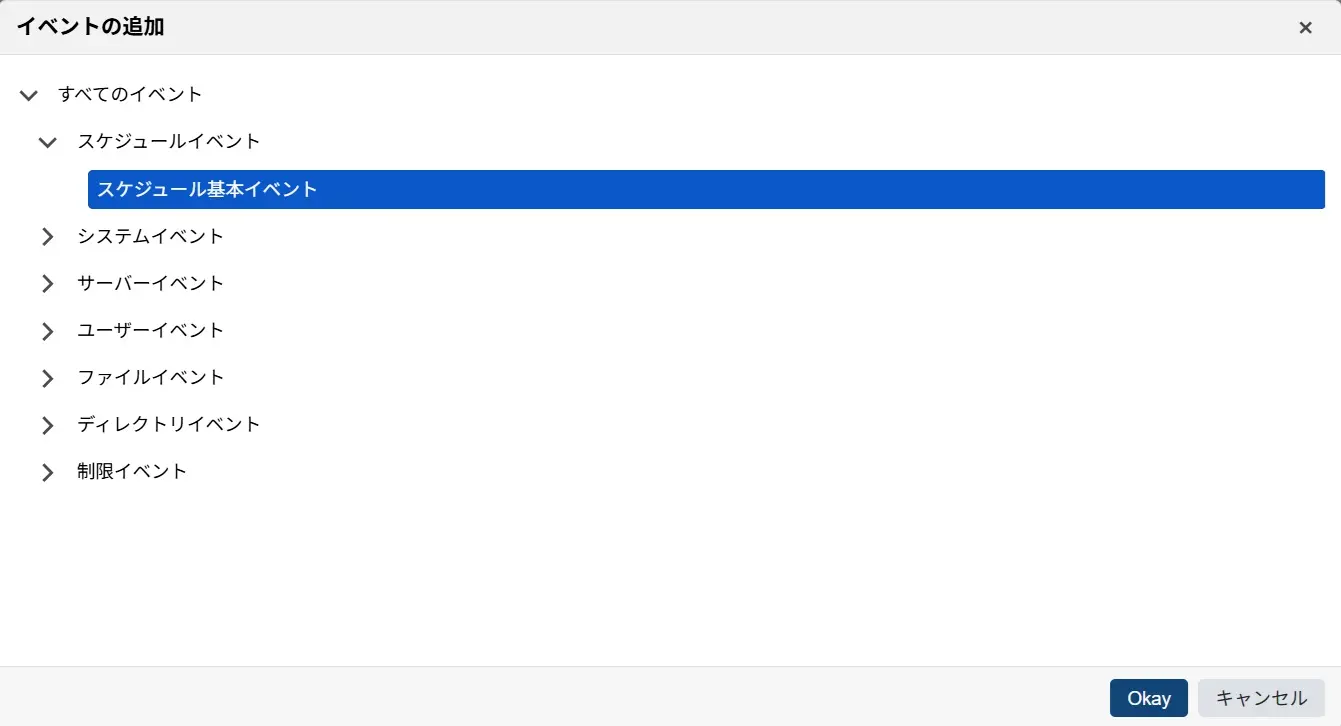 続けて、「スケジュールイベント」から 「スケジュール基本イベント」 を選択しOkayをクリック